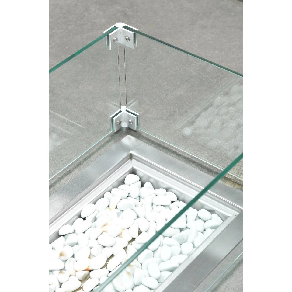 Deze tafel is gemaakt van aluminium, wat ervoor zorgt dat het makkelijk schoon te maken is en tegen de weersomstandigheden kan. De vuurpit bestaat uit een RVS brander en slate ceramic glass blad. De RVS-brander wordt mooi weggewerkt door de meegeleverde witte stenen. Vind je de vlammen toch nog een beetje gevaarlijk? Dit is eenvoudig op te lossen met de glazen ombouw die standaard wordt meegeleverd. De vuurtafel werkt op gas. Deze gasfles kan onder de tafel worden opgeborgen. Hierdoor heb je geen last van een gasslang of gasfles op je terras.Â