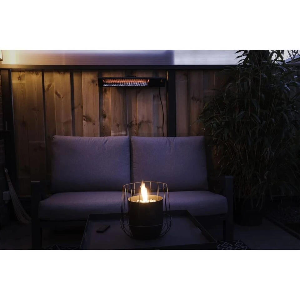 Bedien de heater met je smartphone of tablet (geschikt voor Android- en iOS-apparaten). In aanvulling op het in- en uitschakelen van de terrasverwarmer kan je via de app ook de buitentemperatuur aflezen. Het enige dat je nodig hebt om deze functie te gebruiken is een stabiel wifi-netwerk in de tuin. De heater wordt geleverd met een muurbeugel.